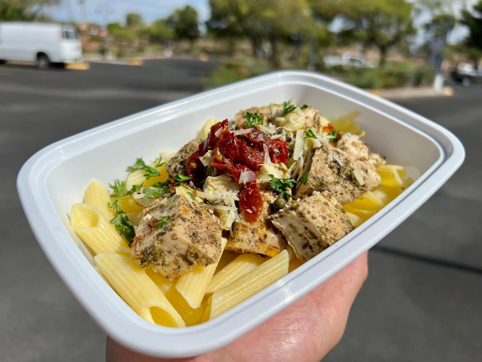 Whole grain penne pasta over a bed of baby spinach, artichoke hearts, sundried tomatoes, and light parm served with chicken, shrimp, or mushrooms